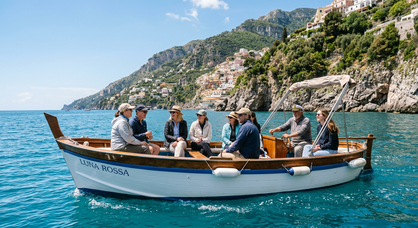 Un'esperienza da vivere, almeno una volta. E poi da ripetere.From our base, we'll take you on a journey of discovery along the coast: we'll set sail aboard a gozzo where the sea deepens and the sea stacks are reflected in the turquoise water. We'll stop at hidden coves, accessible only by sea, so you can be lulled by the silence broken only by the lapping of the waves. Whether it's for half a day or a full day, every trip becomes a memory: an aperitif on the boat at sunset, the wind in your hair, the scent of the sea mingling with that of the Mediterranean scrub.
